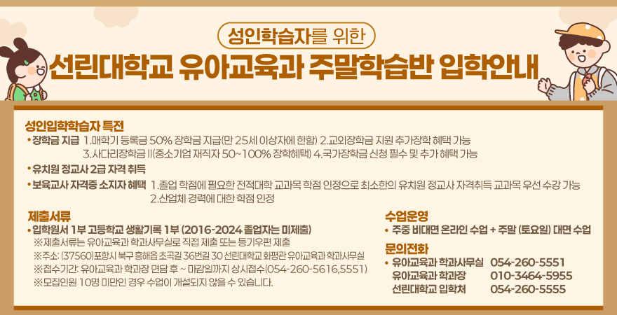 성인학습자를 위한 선린대학교 유아교육과 주말학습반 입학안내